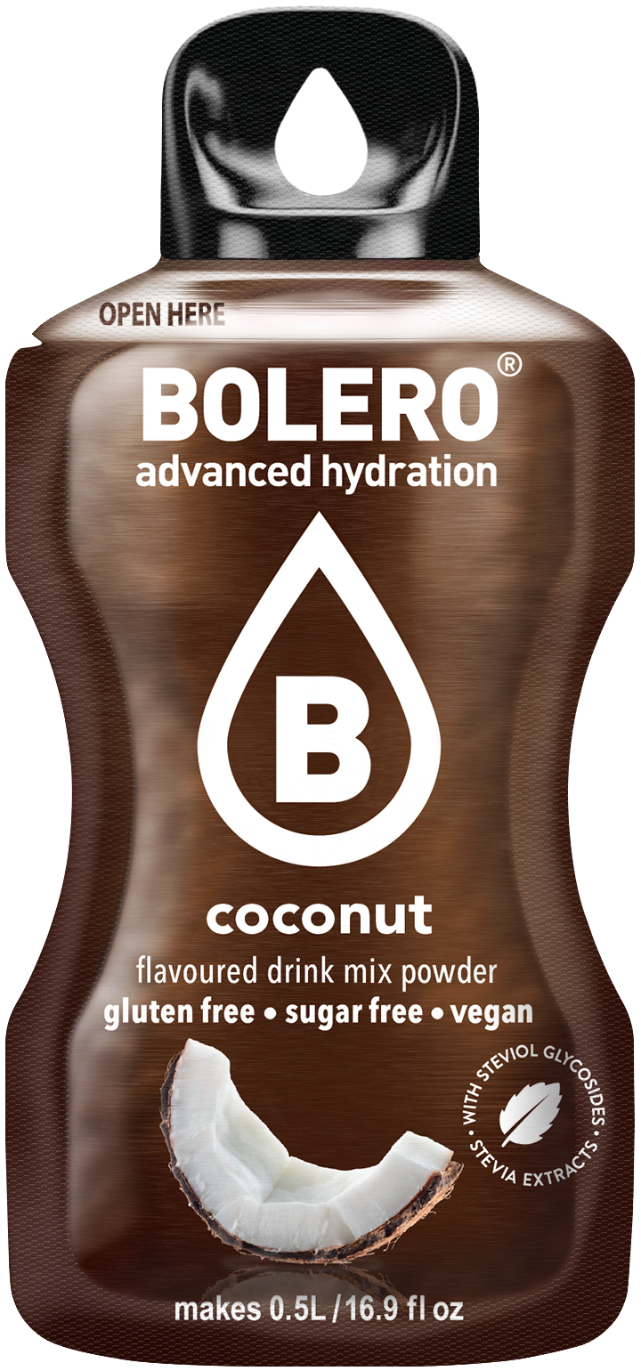 Bolero Sticks - Coconut, il gusto del delizioso cocco in una confezione. Ogni bastoncino è buono per la produzione di 500-1000 ml di Bolero. Comodo per viaggiare, a scuola o durante lo sport. 1 scatola contiene 12 bastoncini.